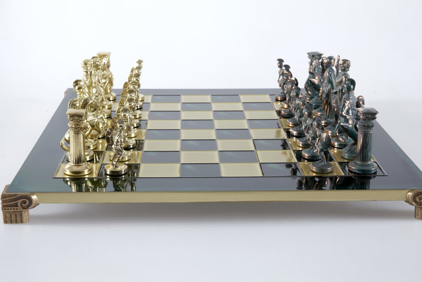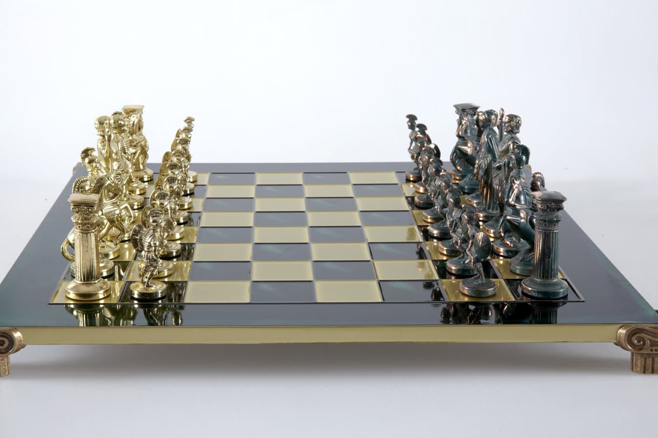 Ein wunderschönes großes Schachset, das von einer Epoche der griechischen Antike inspiriert ist, die von verheerenden Kriegen zwischen den Völkern beherrscht war.
