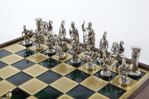 „Römisches und griechisches Zeitalter XXX“ Schachspiel Groß Metall Gold/Silber und Schachbrett Grün/Gold mit Stauraum im Inneren