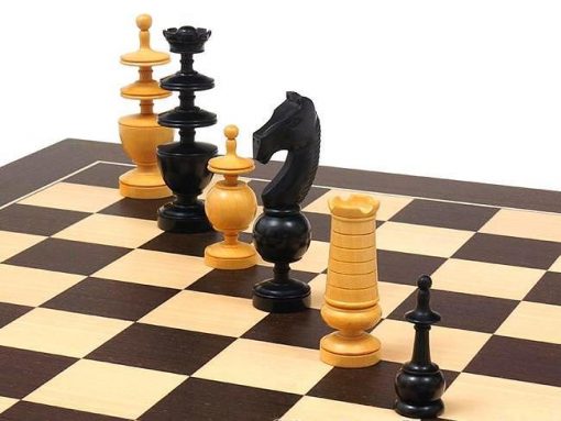 Die Schachfiguren wurden nach einem Entwurf für königliche Schachspiele aus dem 19. Jahrhundert gefertigt. Jede Figur wurde von Hand geschnitzt und durch ein spezielles Tauchverfahren ebonisiert. Dadurch erhält das Holz einen tiefen Schwarzton und besticht durch ein beeindruckendes visuelles Ergebnis.