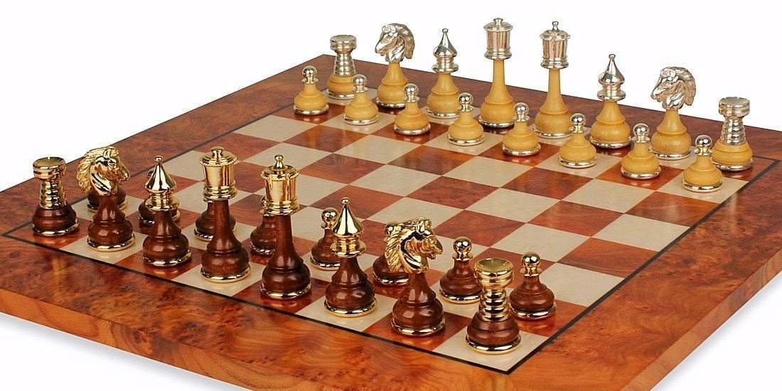 Ein großes Schachset (Königshöhe = 9 cm), dessen Spielfiguren aus Holz und Metall von Hand gefertigt wurden. Sie sind außerdem im oberen Teil mit einer Gold-/Silberbeschichtung versehen.
