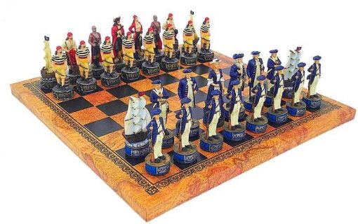 Die Schachfiguren sind von Hand geschnitzt und bemalt. Das Set ist sehr farbenfroh und lässt Piraten gegen die Royal Navy antreten. Ein wunderschönes Schachset mit vielen Details.