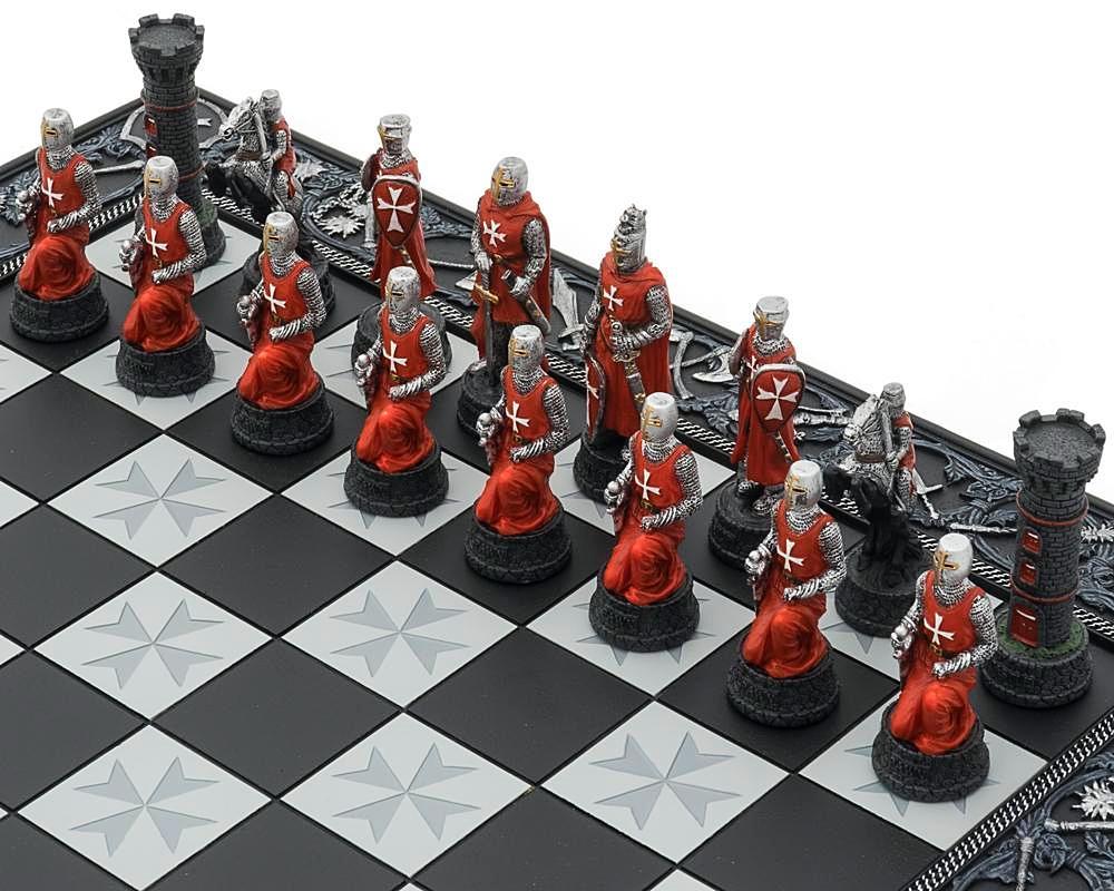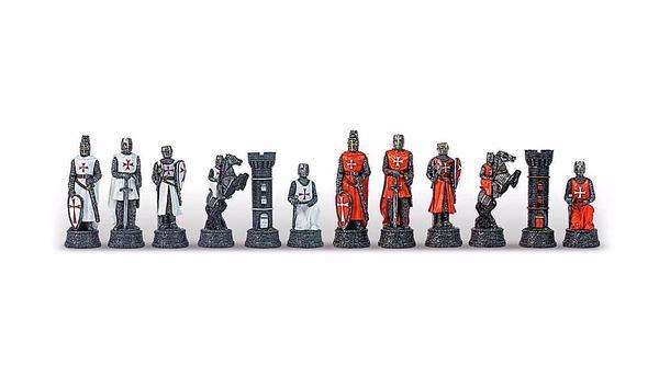 Schachensemble „Templer“ Schachbrett aus Kunstharz Geschnitzt und Schachfiguren aus Kunstharz Handbemalt